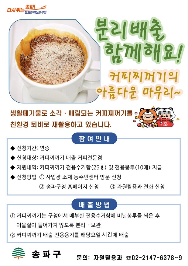 [시민일보 = 이대우 기자] 송파구(구청장 서강석)가 ‘2024년 서울시 커피찌꺼기 재활용 활성화 사업’에서 18개 자치구 중 1위인 ‘최우수구’에 선정됐다. 이번 수상으로 구는 작년 ‘재활용 가능자원 분리배출 공모전’ 전국 1위, ‘서울시 재활용 성과평가’ 1위에 이어 ‘재활용 3관왕’을 달성하게 됐다.