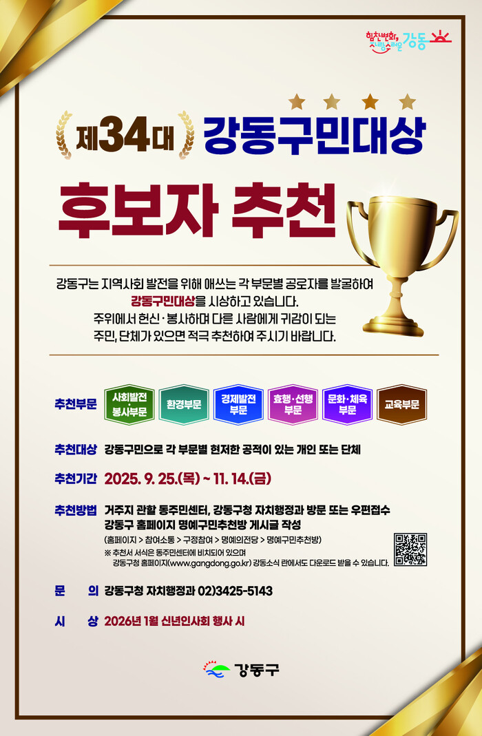한편, 제34대 강동구민대상 시상식은 2026년 1월 열리는 신년인사회에서 진행될 예정으로, 최종 수상자에게는 구 각종 공식 행사에 우선 초청되는 특전과 함께 구정 참여 기회가 제공되며, 보다 자세한 사항은 강동구청 홈페이지 또는 자치행정과를 통해 안내받을 수 있다.