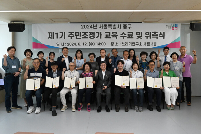 [시민일보 = 여영준 기자] 서울 중구가 최근 신규 주민조정가 24명을 대상으로 주민조정가 양성 교육 수료식 및 주민조정가 위촉식을 개최했다.