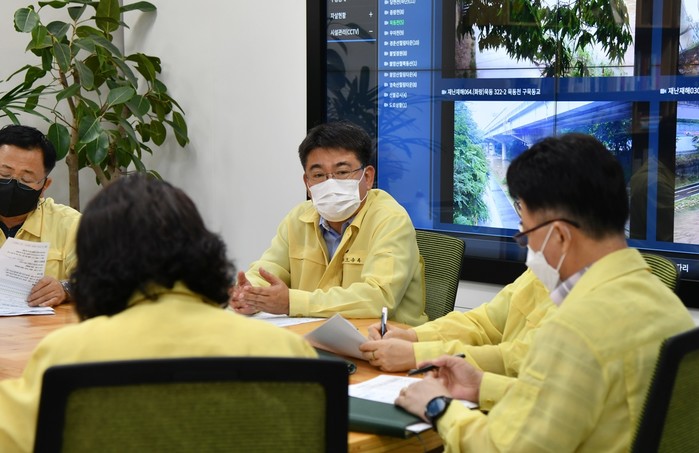 오승록 서울 노원구청장은 지난 9일 집중호우로 인한 지역내 피해 상황과 대응체계를 점검하고자 긴급 대책회의를 주재했다. 접수된 피해상황은 배수불량 18건, 주택침수 17건 등 총 49건이다. 사진은 오 구청장(가운데)이 이날 호우 피해 대비 긴급 대책회의를 주재하고 있는 모습. (사진제공=노원구청)