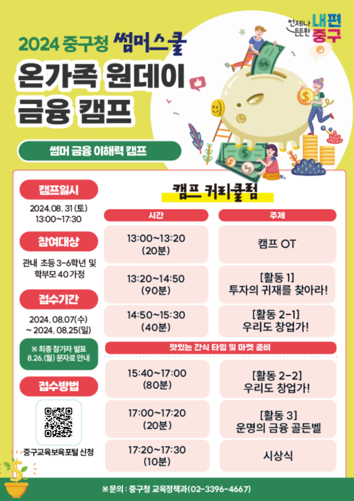 [시민일보 = 여영준 기자] 서울 중구가 지역 청소년의 금융이해력과 올바른 경제관 확립을 돕기 위해 오는 31일 '원데이 금융캠프'를 개최한다.