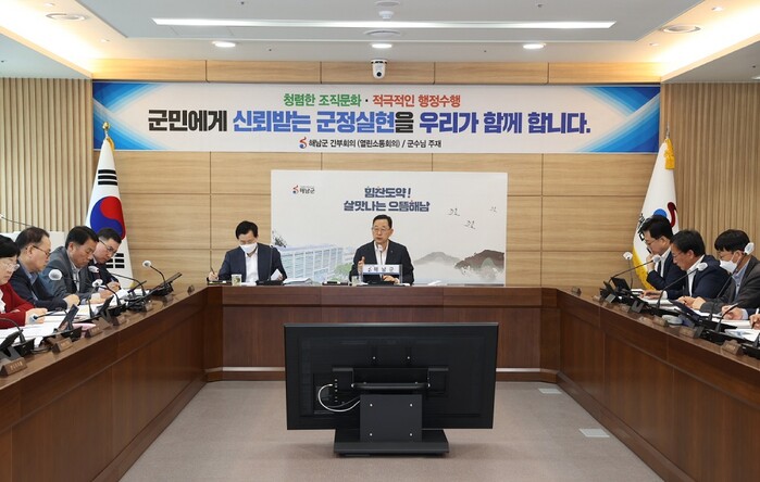 [해남=정찬남 기자] 명현관 해남군수는 10일 정례회의를 통해 “공무원들의 적극적인 행정 자세 정립과 반부패·청렴 문화 정착을 최우선 과제로 실천해 나가자”며 “군민들이 체감할 수 있는 공직사회 변화를 해남군이 주도해 나간다는 자세로 깨끗한 군정, 신뢰의 군정을 만들어야 한다.”고 강조했다.
