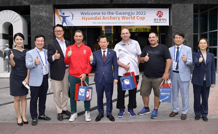 [광주=정찬남 기자] 문영훈 광주광역시 행정부시장(가운데)은 20일 서구 유탑부티크 호텔에서 광주 2022 양궁월드컵에 1인 선수로 참가한 체코, 버진 아일랜드, 모로코 등 5개국 선수들과 오찬을 한 후 기념촬영을 하고 있다./광주광역시 제공
