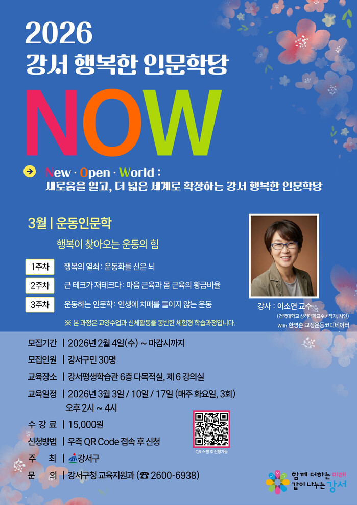 [시민일보 = 박소진 기자] 서울 강서구(구청장 진교훈)가 자신의 몸과 건강을 탐구하고 싶은 주민을 위해 운동 인문학 강의를 마련해 수강자 30명을 모집한다.