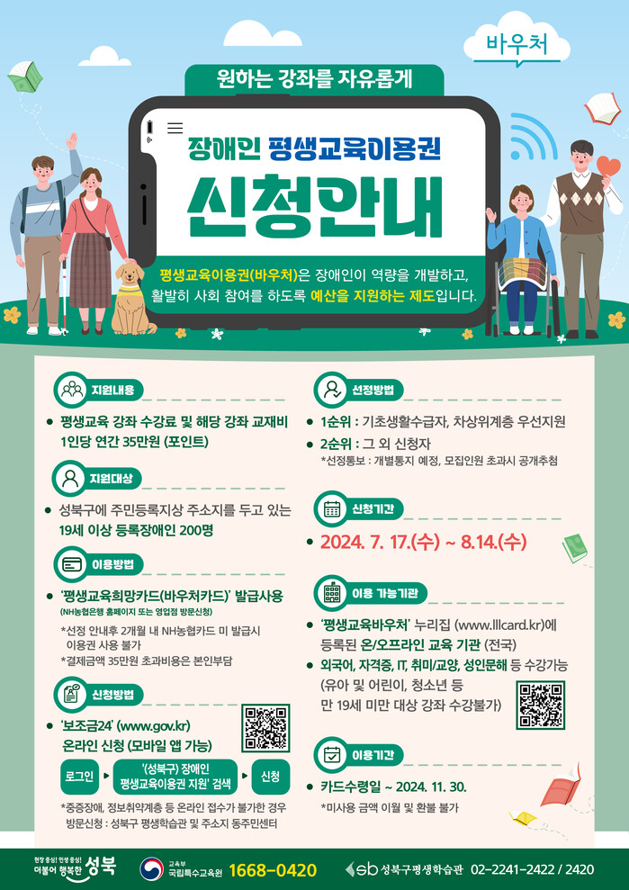 신청은 보조금24 홈페이지에서 ‘성북구 장애인 평생학습이용권’을 검색해 온라인(모바일 앱 가능)으로 오는 8월14일까지 신청하면 된다. 중증장애 등으로 온라인 신청이 어려운 경우 구비서류를 갖춰 성북구평생학습관이나 주소지 동주민센터를 방문해 접수할 수 있다.