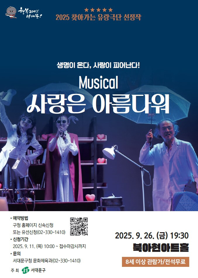 [시민일보 = 이대우 기자] 서울 서대문구(구청장 이성헌)가 오는 26일 오후 7시30분 북아현아트홀에서 2025 찾아가는 유랑극단 ‘사랑은 아름다워’ 공연을 개최한다.