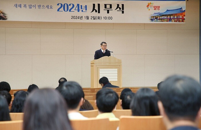 시는 지난 2023년 밀양시 경제 활성화, 복지증진 및 시정발전 유공자에 대한 표창패와 표창장을 수여했으며, 이종황 행정국장이 2024년 새해를 맞이해 시민의 안녕과 행복을 추구하기 위해 공무원헌장을 낭독했다.
