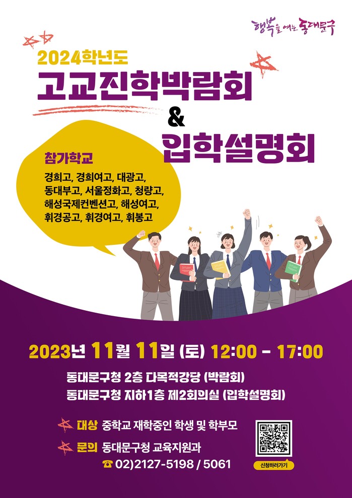 [시민일보 = 이대우 기자] 서울 동대문구(구청장 이필형)는 오는 11일 낮 12시부터 오후 5시까지 구청 2층 강당과 지하 1층 제2회의실에서 ‘2024학년도 고교 진학정보 박람회 및 입학설명회’를 개최한다.