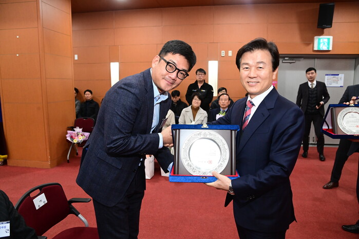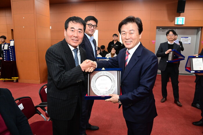 진주시는 21일 시청 시민홀에서 ㈜락토메이슨 손민 대표와 ㈜동양 문대근 대표에게 올해의 최고경영자상 표창을 수여했다.