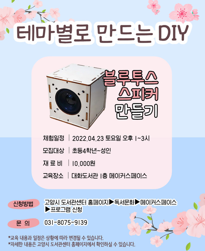 고양시 도서관센터 홈페이지→독서문화→메이커스페이스→프로그램 신청에서 신청하거나 대화도서관 메이커스페이스로 문의하면 된다.