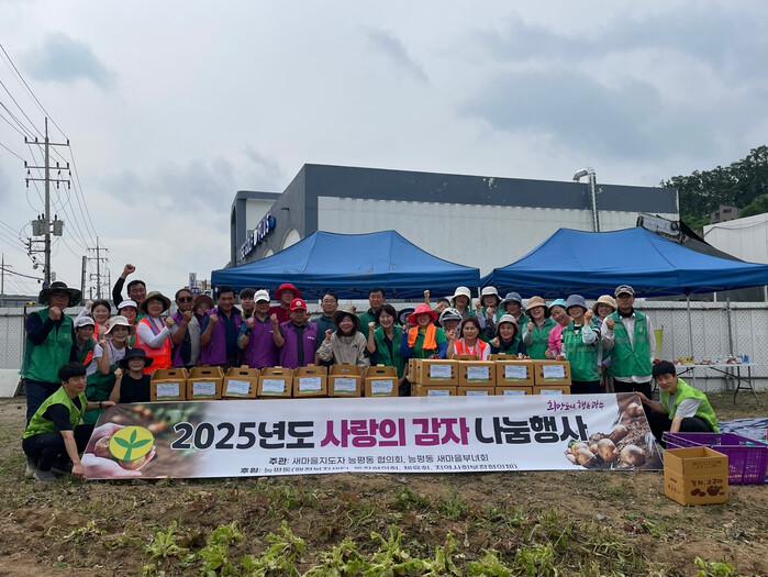 경기 광주시 능평동 새마을지도자협의회와 새마을부녀회는 4일 능평동 175-8 일원 텃밭에서 지역 농업 활성화와 소외계층 지원을 위한 ‘사랑의 감자 캐기’ 봉사활동을 실시했다. 사진은 봉사자들이 기념 촬영을 하는 모습. (사진=광주시청 제공)