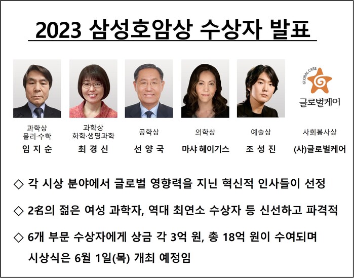 [시민일보 = 여영준 기자] 호암재단이 '2023 삼성호암상 수상자'를 선정해 지난 5일 발표했다.