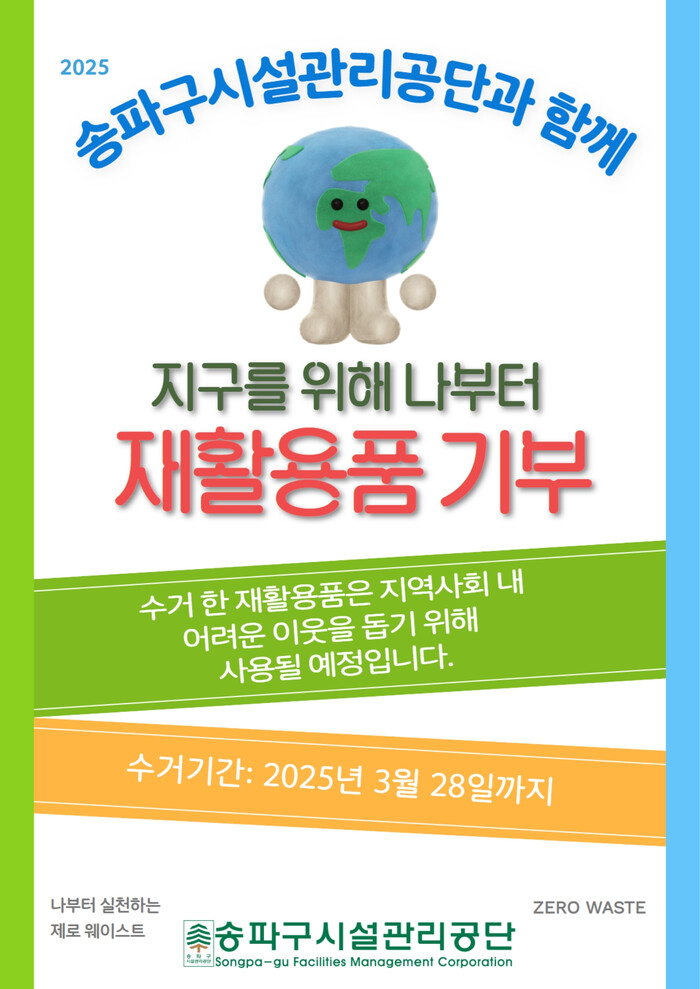 [시민일보 = 이대우 기자] 송파구시설관리공단(이사장 황대성, 이하 "공단")은 ESG경영 실천의 일환으로 지역주민과 함께하는 사회적 나눔 활동인 "재활용품 기부 캠페인"을 추진할 예정이라고 10일 밝혔다.