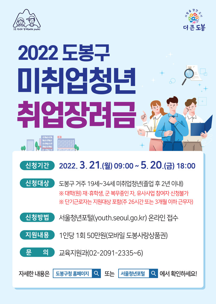 [시민일보 = 박준우 기자] 도봉구(구청장 이동진)가 코로나19 장기화로 취업에 어려움을 겪고 있는 미취업 청년들에게 취업장려금 50만원을 지원한다고 17일 밝혔다.