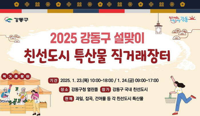 [시민일보 = 이대우 기자] 강동구(구청장 이수희)는 을사년 설을 맞이해 오는 23일부터 이틀간 ‘친선도시 특산물 직거래장터’를 강동구청 열린뜰에서 개최한다고 밝혔다.