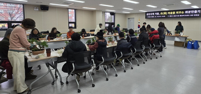 [인천=문찬식 기자] 인천 부평구 삼산1동 지역사회보장협의체는 지난 10일 동 행정복지센터 2층 대회의실에서 ‘온(溫) 마음을 피우는 화분 만들기’ 프로그램을 운영했다.