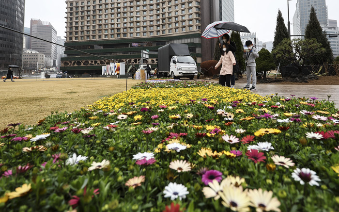 봄비가 내리는 13일 오전 서울광장에서 한 가족이 광장에 식재할 꽃을 보며 사진을 찍고 있다.