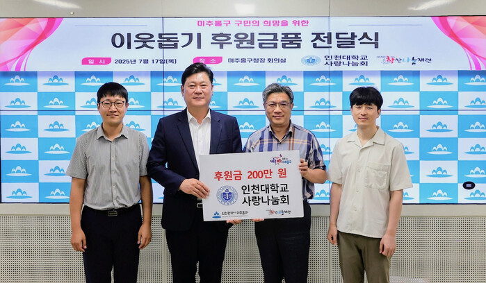 [인천=문찬식 기자] 인천 미추홀구(구청장 이영훈)는 17일 구청장실에서 인천대학교 사랑나눔회(회장 채진석)로부터 저소득 가정을 위한 후원금 200만 원을 전달받았다.