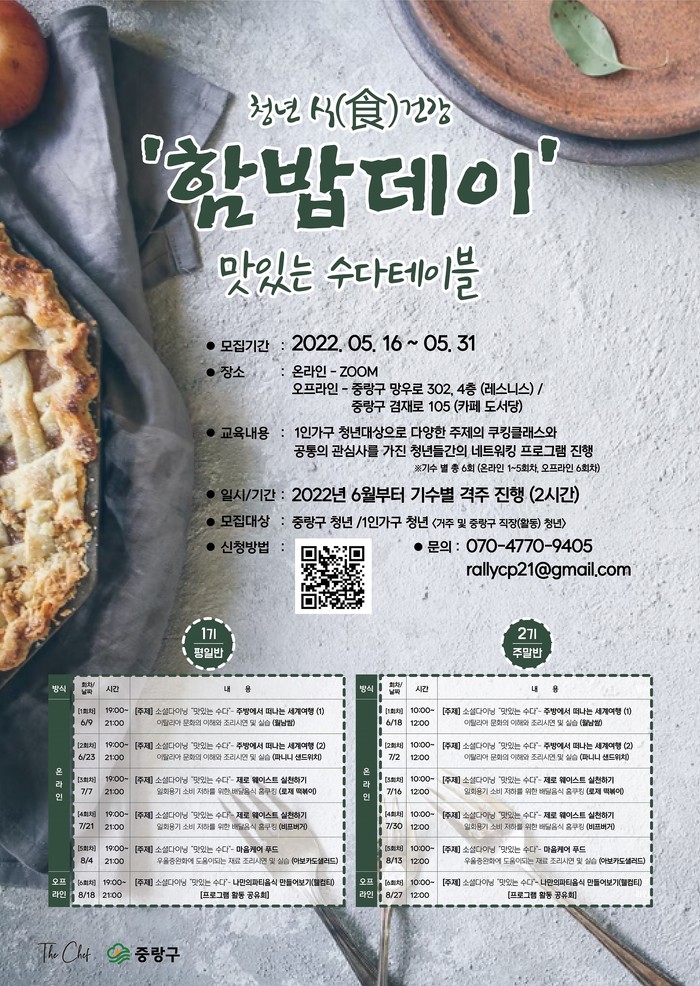 [시민일보 = 여영준 기자] 중랑구는 오는 6~8월 1인 가구 청년들의 식(食) 건강을 위한 ‘함밥데이 맛있는 수다 테이블’ 프로그램을 운영한다고 24일 밝혔다.