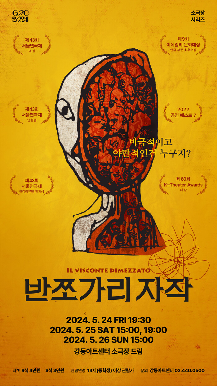 환상문학의 세계적 거장인 이탈리아 작가 이탈로 칼비노의 소설을 원작으로 하는 연극 <반쪼가리 자작>. 2022년 제43회 서울연극제에서 대상, 연출상, 관객리뷰단 인기상을 수상하며 3관왕 석권을 시작으로 제9회 이데일리 문화대상 연극 부문 최우수상, 2022 공연 베스트 7에 선정되었으며, 제60회 K-Theater Awards 대상을 수상하며 심사위원과 관객들을 사로잡았다.