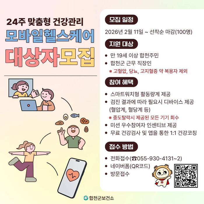 신청은 합천군 보건소 통합건강증진실로 전화 또는 방문하거나, 네이버폼을 통해 가능하다.