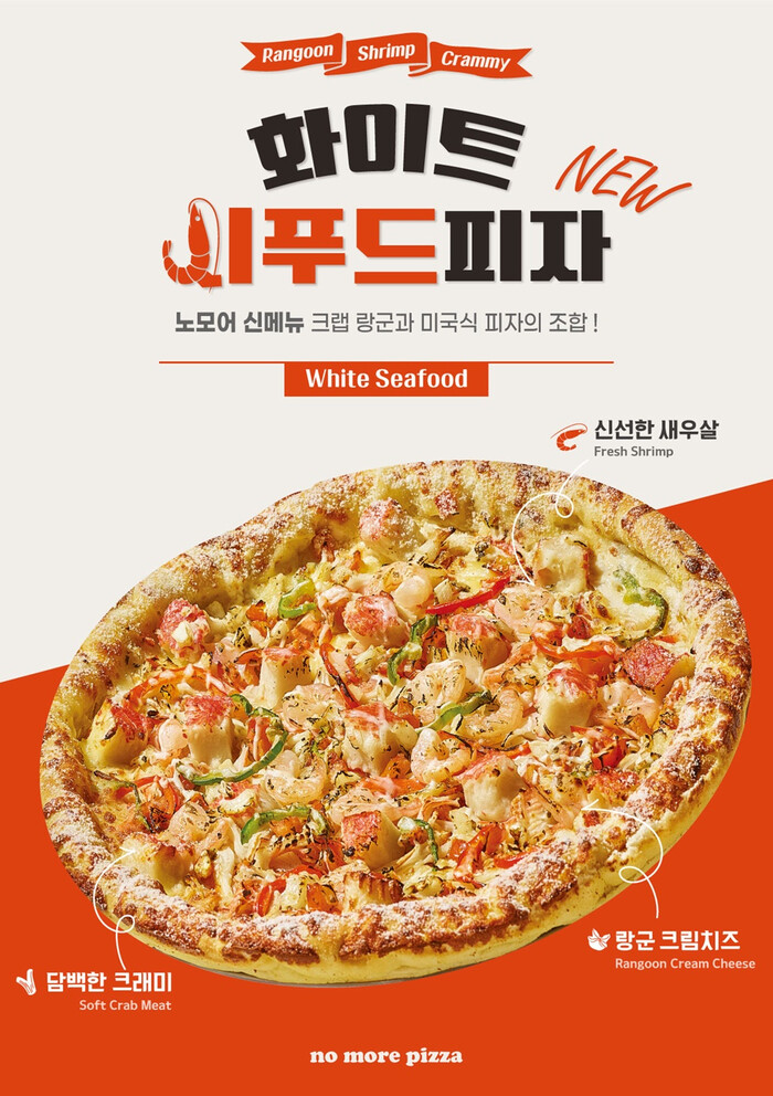노모어피자는 앞으로도 다양한 메뉴 개발과 서비스 개선을 통해, 더 많은 소비자에게 새로운 피자 경험을 전달할 계획이다. 노모어피자의 ‘화이트 시푸드 피자’는 전국 노모어피자 매장과 배달 앱을 통해 만나볼 수 있다.