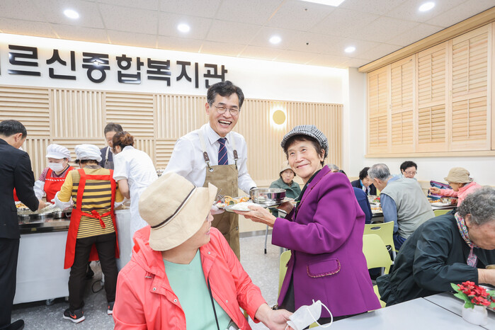 | ▲ 양천어르신종합복지관 경로식당에서 따뜻한 한 끼 식사를 배식 중인 이기재 구청장. 사진=양천구청 제공) |