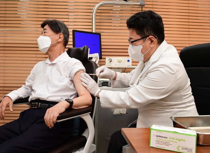 코로나19 2가 백신 추가 접종 첫날인 11일 서울 강남구 개포동의 소아청소년과 의원에서 1순위 권고대상인 60대 이상의 남성이 모더나의 새롭게 업데이트된 코로나19 2가 백신인 스파이크박스 2주를 접종하고 있다.