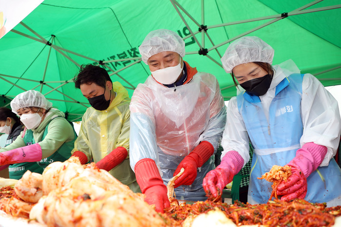 | ▲ 김장 나눔 행사에 참석한 조석환 의장(오른쪽 두 번째)이 김치를 담그고 있다. (사진제공=수원시의회) |