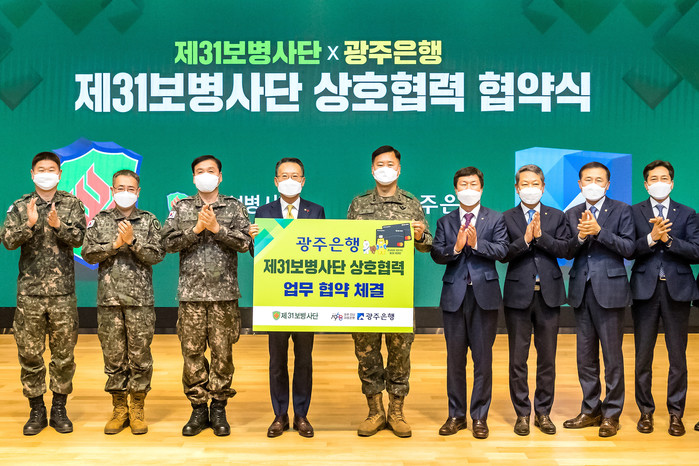 [시민일보 = 이대우 기자] 광주은행(은행장 송종욱)은 송종욱 광주은행장과 최순건 제31보병사단장이 참석한 가운데 제31보병사단 상호협력 협약식을 가졌다고 밝혔다.