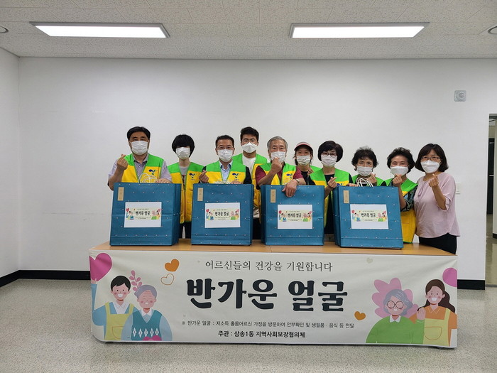 삼송1동 지역사회보장협의체는 특화사업으로 홀몸어르신가구의 고독사를 방지하고, 사회적 돌봄을 강화하기 위해 매분기 지역사회보장협의체 위원과 행정복지센터 직원이 함께 조별로 나누어 어르신 안부 확인차 가정방문하며 식품 및 생활용품을 전달하는 ‘반가운 얼굴사업’ 을 추진하고 있다.