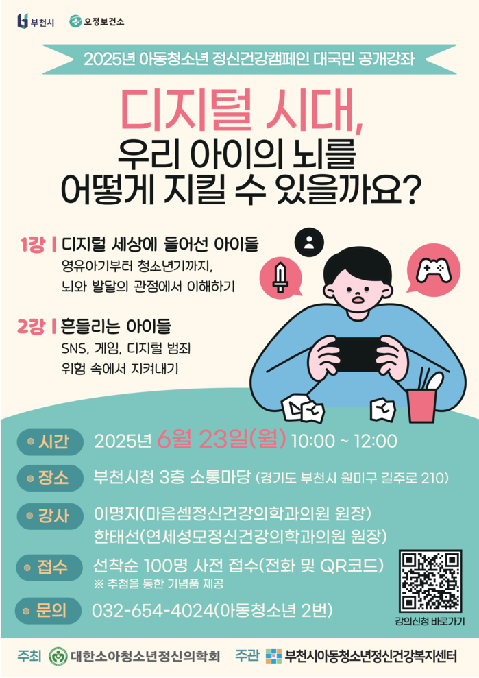 이번 강좌는 부천시민 누구나 무료로 참여할 수 있으며, 사전 신청은 19일까지 부천시아동청소년정신건강복지센터로 전화 또는 배포된 홍보물의 큐알(QR)코드로 접수하면 된다. 참여는 선착순 100명으로 제한된다.