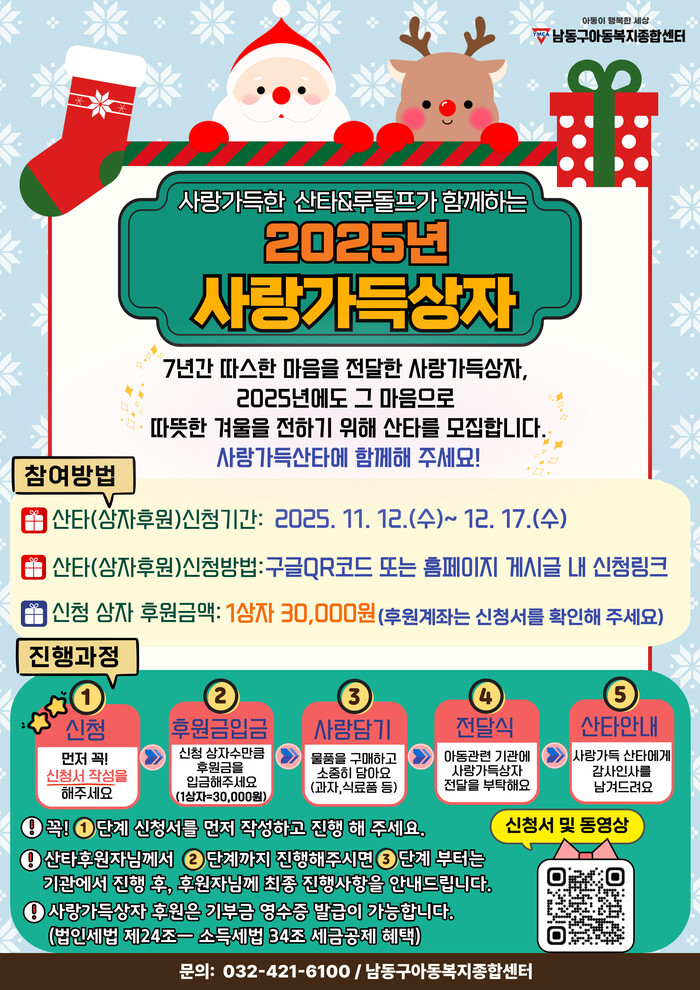 후원 신청은 구글 QR코드 또는 남동구 아동복지종합센터 홈페이지를 통해 가능하며, 모집 기간은 2025년 12월 17일(수)까지다.