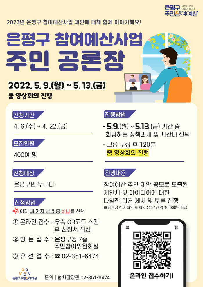 이번 주민 공론장은 2023년 은평구 참여예산 주민 제안 공모를 통해 발굴된 제안 및 아이디어에 관하여 이야기하는 토론장으로 5일간의 전 회차가 줌 영상회의를 통해 120분간 진행된다.