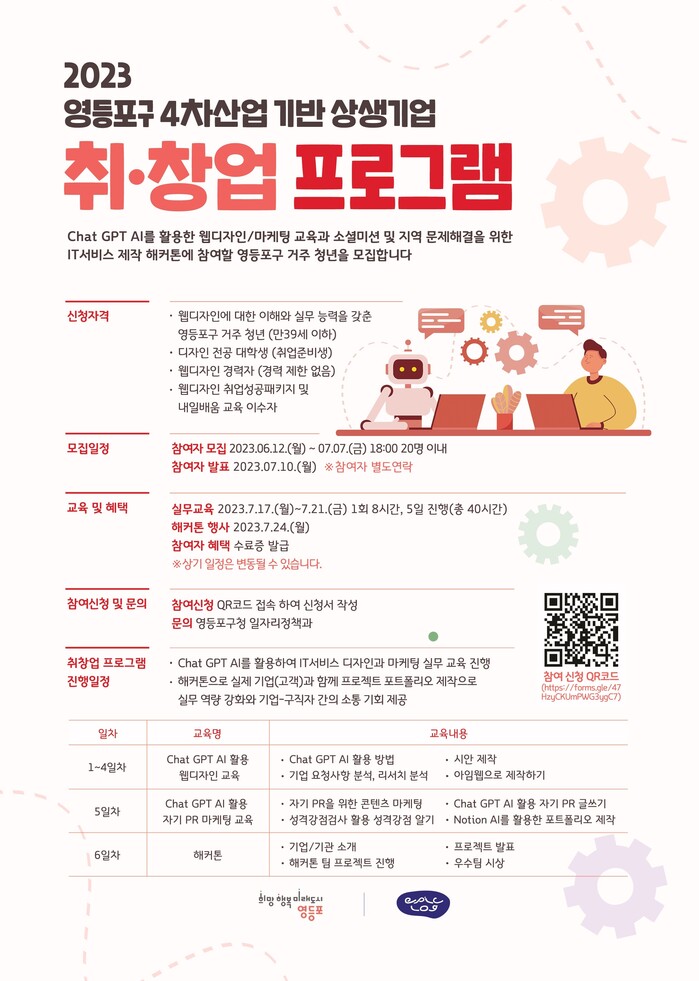 실무 교육은 오는 7월17~21일 총 40시간 과정이다. 챗 GPT와 AI를 활용한 ▲웹디자인 제작 ▲상생기업 홍보페이지 제작 ▲온라인 마케팅 ▲자기 PR 마케팅 등 청년들의 IT 실무 역량 강화에 집중한다.