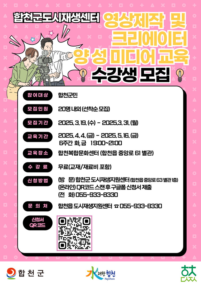 이번 교육은 22년 국토교통부 공모에 선정된 합천읍 지역특화 도시재생사업의 주민 역량강화사업의 일환으로, 영상미디어 콘텐츠 제작 및 인프라 지원을 강화하여, 앞으로 조성될 미디어 거점 시설의 지속적인 운영과 효율적인 활용을 위한 맞춤형 미디어 교육으로 진행된다.