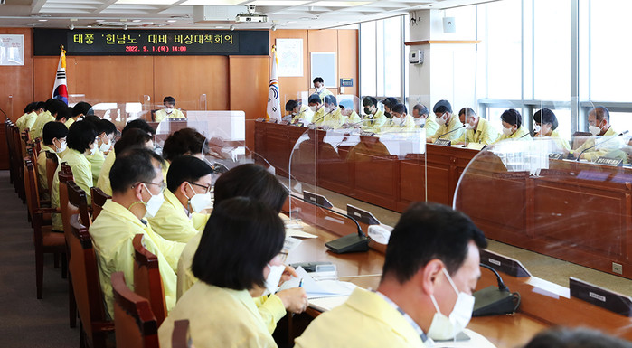 서울 성동구는 제11호 태풍 ‘힌남노’가 북상하면서 큰 피해가 예상됨에 따라 신속대응반을 구성하고, 취약 지역을 점검하는 등 비상근무 체제에 돌입했다. 사진은 최근 태풍 ‘힌남노’ 대비 비상대책회의를 개최하고 있는 모습. (사진제공=성동구청)