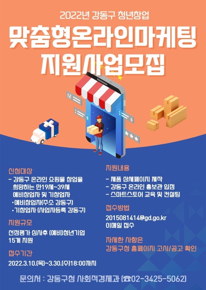 [시민일보 = 이대우 기자]서울 강동구(구청장 이정훈)가 청년 (예비)창업자의 성공적인 온라인 창업과 매출성장을 위해 ‘청년창업 온라인 마케팅지원’ 사업을 추진한다.