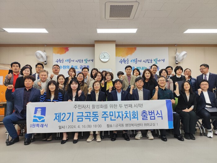 경기 수원시 권선구 금곡동 주민자치회는 지난 16일 금곡동행정복지센터에서 제2기 주민자치회 출범식을 열었다. 이날 출범식에서는 위촉장 전수와 임원진을 선출했다. 사진은 관계자들이 기념촬영을 하고 있는 모습. (사진=권선구청 제공)