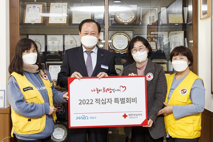 서울 마포구가 20일 대한적십자사봉사회 마포지구협의회에 특별회비 100만원을 전달했다. 이번 특별회비 전달식은 구민의 자발적인 모금 참여 분위기를 조성하기 위해 마련됐다. 사진은 전달식에서 유동균 구청장(왼쪽 두 번째)과 관계자들이 기념촬영을 하고 있는 모습. (사진제공=마포구청)