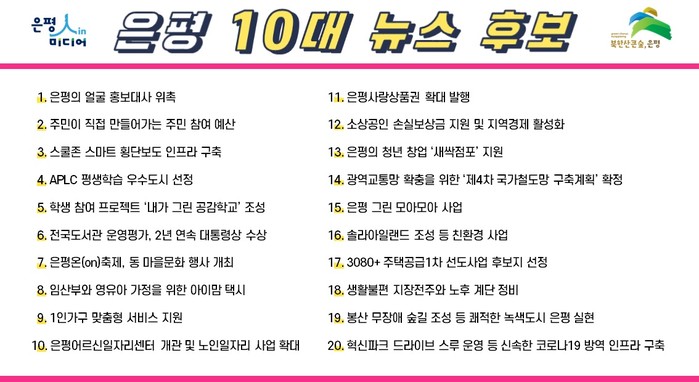 올해 은평 10대 뉴스 후보는 ▲은평의 얼굴, 홍보대사 위촉 ▲주민 참여 예산 ▲스쿨존 스마트 횡단보도 인프라 구축 ▲APLC 평생학습 우수도시 선정 ▲내가 그린 공감학교 조성 ▲전국도서관 운영평가 2년 연속 대통령상 수상 ▲은평온 축제, 동 마을문화 행사 개최 ▲아이맘 택시 ▲1인가구 맞춤형 서비스 ▲은평어르신일자리센터 개관 및 노인일자리 사업 확대 ▲은평사랑상품권 확대 발행 ▲소상공인 손실보상금 지원 및 지역경제 활성화 ▲은평의 청년 창업 ‘새싹점포’ 지원 ▲‘제4차 국가철도망 구축계획’ 확정 ▲은평 그린 모아모아 사업 ▲솔라아일랜드 조성 등 친환경 사업 ▲3080+ 주택공급1차 선도사업 후보지 선정 ▲생활불편 지장전주와 노후 계단 정비 ▲봉산 무장애 숲길 조성 등 쾌적한 녹색도시 은평 실현 ▲혁신파크 드라이브 스루 운영 등 신속한 코로나19 방역 인프라 구축 총 20개다.