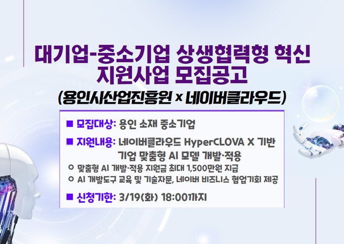 올해 처음 추진하는 이 사업은 인공지능(AI)·클라우드 분야 전문기업인 ‘네이버클라우드’와 함께 AI 분야의 기업을 지원할 예정으로, 양 기관은 용인시 인공지능 산업 발전과 기업지원 협력을 위해 지난 2월 23일 업무협약을 체결했다.