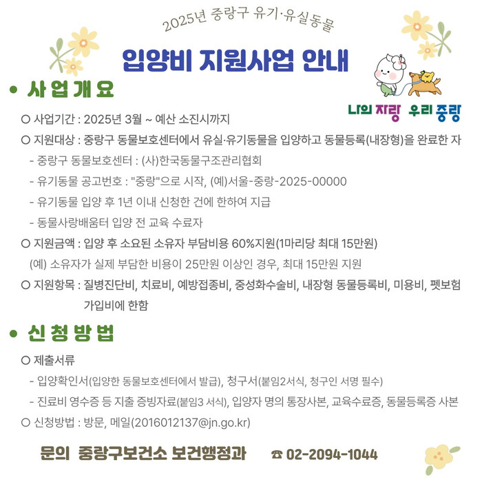 | ▲ 2025년 중랑구 유기‧유실동물 입양비 지원사업 안내. (사진=중랑구청 제공) |