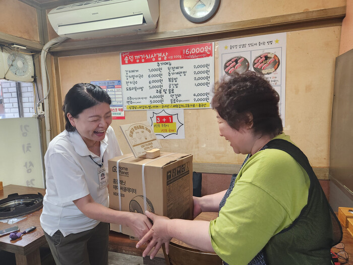 | ▲ 탄소중립 선정 가게에 탄소중립 맛집 안내판을 전달하고 있다. (사진=도봉구청 제공) |