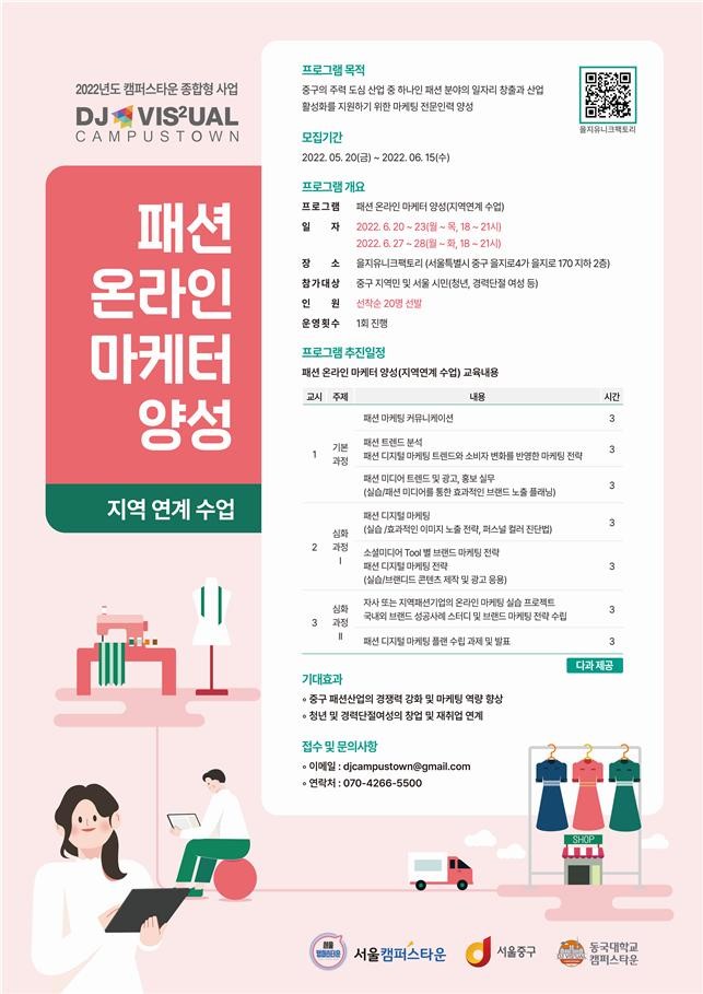 '패션 온라인 마케터 양성 과정'은 중구의 주력 도심산업 중 하나인 패션 산업의 경쟁력 강화를 위한 마케팅 전문인력 양성 과정으로, 청년 및 경력단절여성의 패션 분야 일자리 창출에도 기여할 것으로 기대된다.