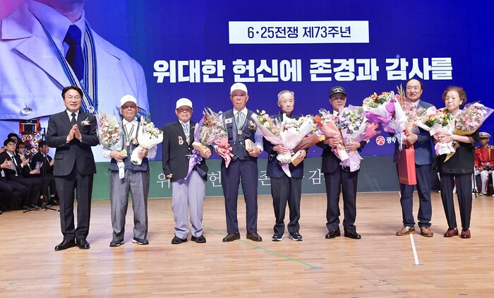 [광주=정찬남 기자] 광주광역시는 6·25전쟁 제73주년을 맞아 25일 오전 10시 빛고을시민문화관에서 6‧25전쟁 참전용사들의 희생과 헌신을 기리고 한반도 평화의 소중함과 안보의식을 고취하기 위해 기념행사를 개최했다.