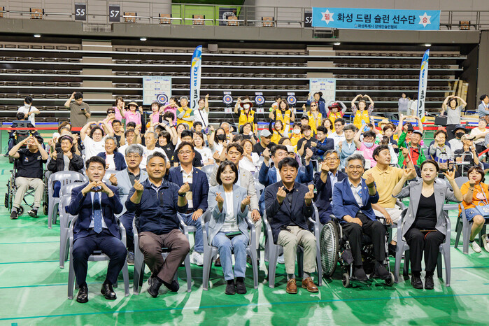 | ▲ 화성특례시의회는 10일 화성종합경기타운 실내체육관에서 열린 제4회 장애인 한마음 체육대회에 참석 단체 기념 촬영을 하고 있다 /사진제공=화성특례시의회 |