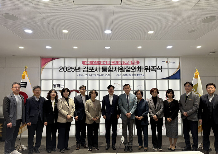 경기 김포시가 최근 ‘제1기 김포시 통합지원협의체 위촉식’을 개최하고, 본격적인 지역사회 통합돌봄 체계 구축에 나섰다. 이날 행사에는 지역의료기관, 요양시설, 복지기관 등 다양한 분야의 돌봄 전문가와 관계 공무원 등 총 15명의 위원이 참석해 위촉장을 수여받았다. 사진은 김병수 시장(가운데)이 위원들과 기념촬영을 하고 있는 모습. (사진=김포시청 제공)