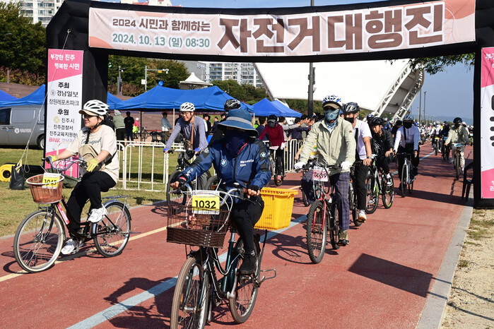 자전거 대행진은 하대동 남강야외무대를 출발해 진주 도심을 가로질러 남강변 친환경 자전거도로를 따라 진양교와 새벼리 강변자전거도로를 지나 김시민대교를 거쳐 왕복 13㎞ 코스로 진행됐다. 완주자에게는 1만원권 진주사랑상품권이 지급됐다.
