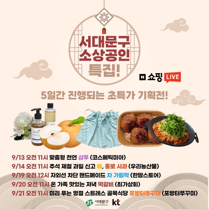 [시민일보 = 홍덕표 기자] 서대문구(구청장 이성헌)는 지역 소상공인들의 온라인 판로 확대 지원을 위해 추석맞이 특집 '라이브커머스'(실시간 소통 판매) 방송을 진행한다고 12일 밝혔다.